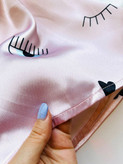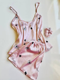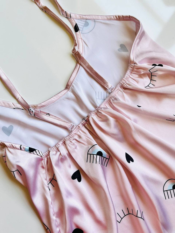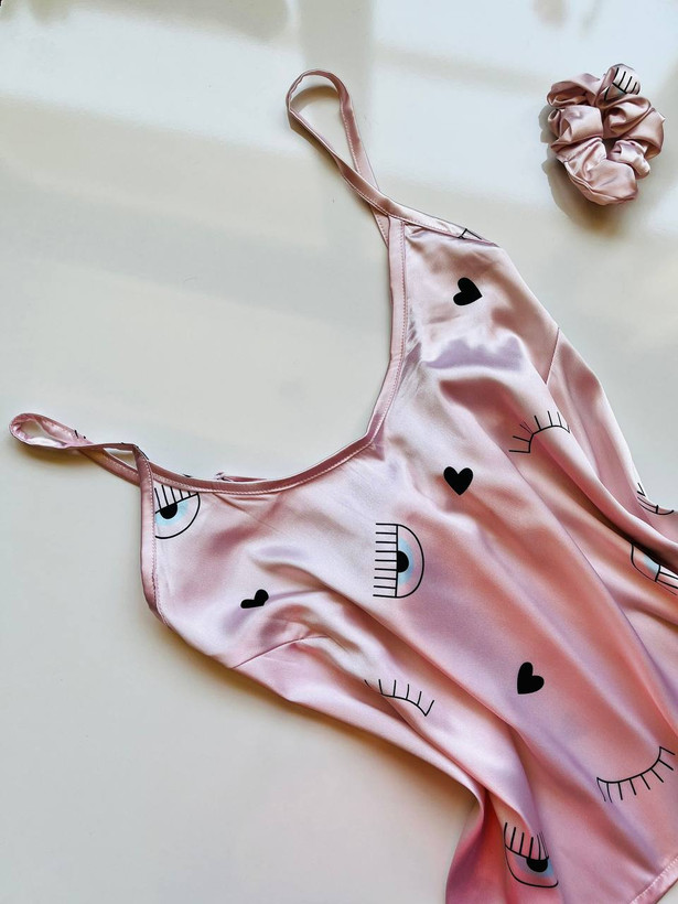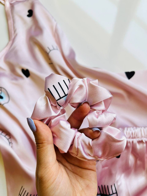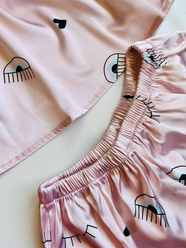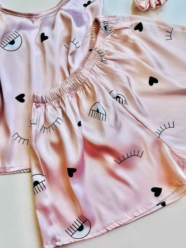 ست تاپ شلوارک ساتن زنانه طرح چشم و قلب با اسکرانچی مو