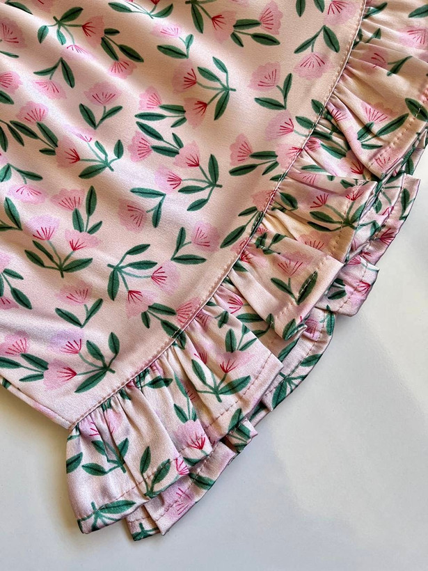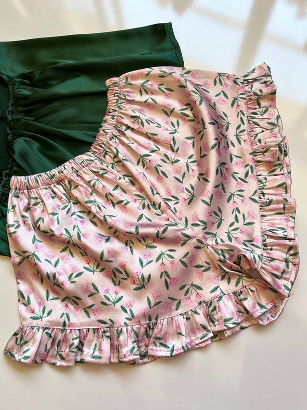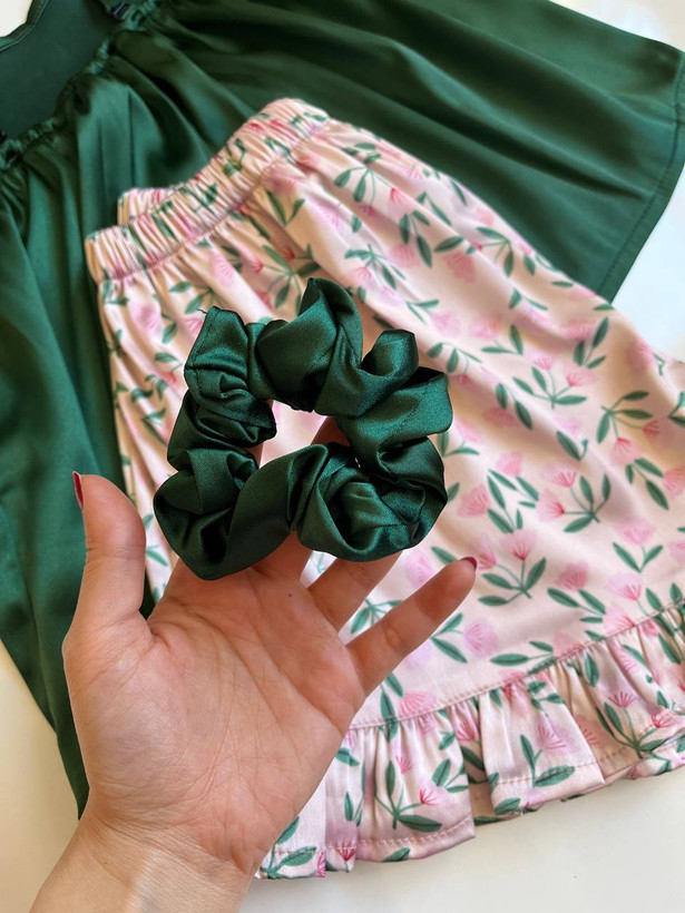 ست تاپ شلوارک ساتن زنانه طرح گل بهاری(با اسکرانچی مو)