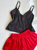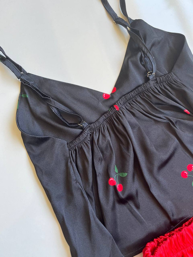 ست تاپ شلوارک ساتن طرح آلبالو که کلی شیک و جذابه😍❤️🔥🍒